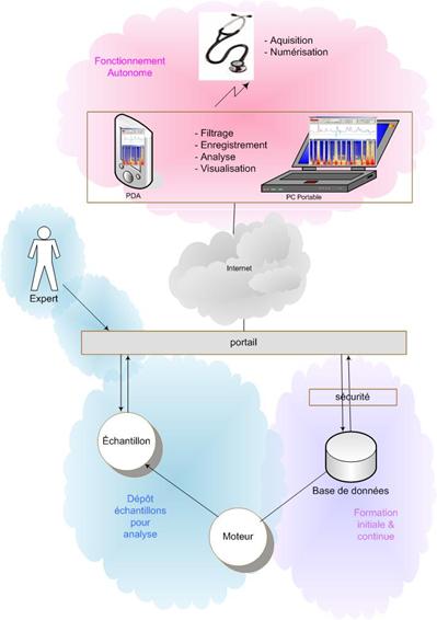 principale/indépendante, décomposition parcimonieuse, matching pursuit. [texte fourni par le LSIIT] o On s'intéressera dans un premier temps à modéliser et caractériser le signal 1D, afin de fournir aux médecins en formation des outils de visualisation leur permettant d'identifier différentes pathologies à partir d'une base de données baptisée WebSound, base référentielle mondiale de sons qualifiants. o Dans un second temps, il s'agira de mettre en œuvre les outils d'identification et de classification de signatures acoustiques destinés à aider le médecin formé dans l'établissement de son diagnostic. o la confidentialité, la sécurisation, l’intégrité des données dans une logique d’interaction forte avec les standards développés pour le Dossier Médical Personnel (ce dossier comportera à terme les informations issues de notre système témoignant de l’auscultation) o le périmètre d’intervention médico-légal du système : quand, comment déclencher une situation d’urgence ? (établir une échelle de qualification des sons d’auscultation : quand alerter un porteur de valve cardiaque car sa valve se dégrade ? Quand alerter un patient infecté au poumon d’une situation d’encombrement pulmonaire anormale ?) o la fiabilité des informations captées, la reproductibilité des gestes de prise de mesure, l’éducation du patient (ou sa famille) à la mise en œuvre de ce système o la robustesse et la stabilité pour éviter toute perte de données o l’insertion psychologique du dispositif : la définition claire de ses limites, sa vocation, son utilisation quotidienne, son accessibilité (ergonomie,…) o la standardisation des protocoles de transmission de mesures utilisés o le développement de descripteurs robustes adaptés aux différentes pathologies Ø En ce qui concerne l’enseignement et le télé-enseignement de ces nouvelles bonnes pratiques médicales : o le positionnement de ce type d’applications au jour le jour pour le professionnel de santé : lecture des dossiers patients, contre-visite, diagnostique distant… o La mise en œuvre d’interfaces hommes-machines conviviales et ergonomiques pour l’utilisation du dispositif o La mise en œuvre de supports interactifs pertinents et efficaces pour la formation des médecins o La définition d’un système pérenne pour la création et la croissance de l’Ecole de l’Auscultation : première mondiale hébergée en France, avec la collaboration de l’Hôpital Necker Enfants Malades, où le stéthoscope et l‘auscultation furent inventés par le Dr Laennec en 1816. Ces contraintes fortes seront étudiées afin de proposer des solutions pragmatiques lors de l’expression de besoins et la définition du périmètre du projet. 2. Contexte et état de l’art2.1. Etat de l’Art2.1.1. WebSurg - l’université chirurgicale virtuelleWebSurg est une Université Virtuelle Strasbourgeoise d’accès gratuit sur