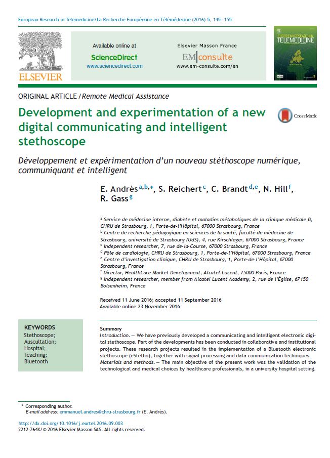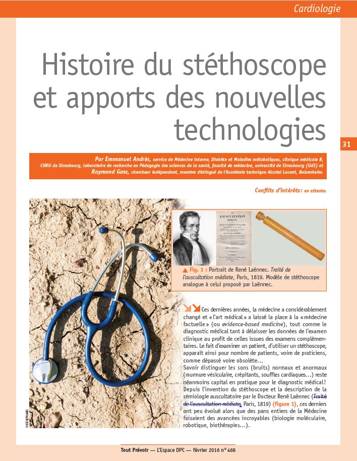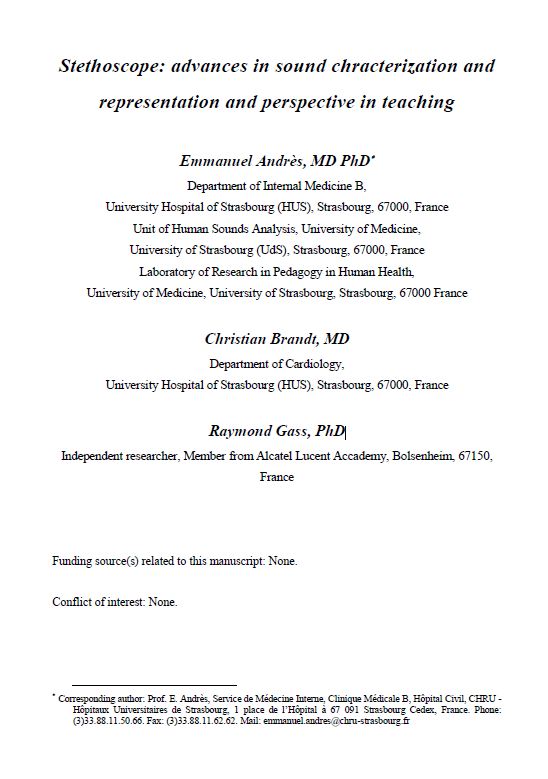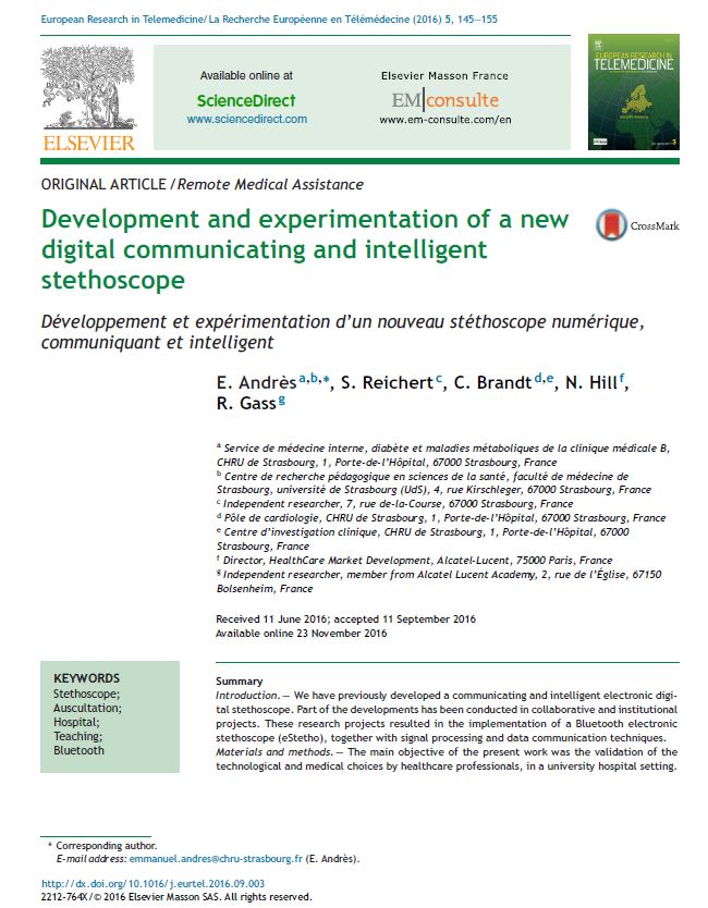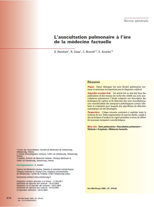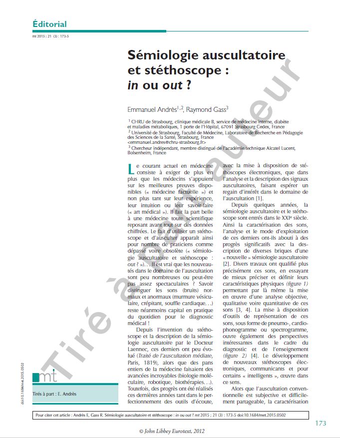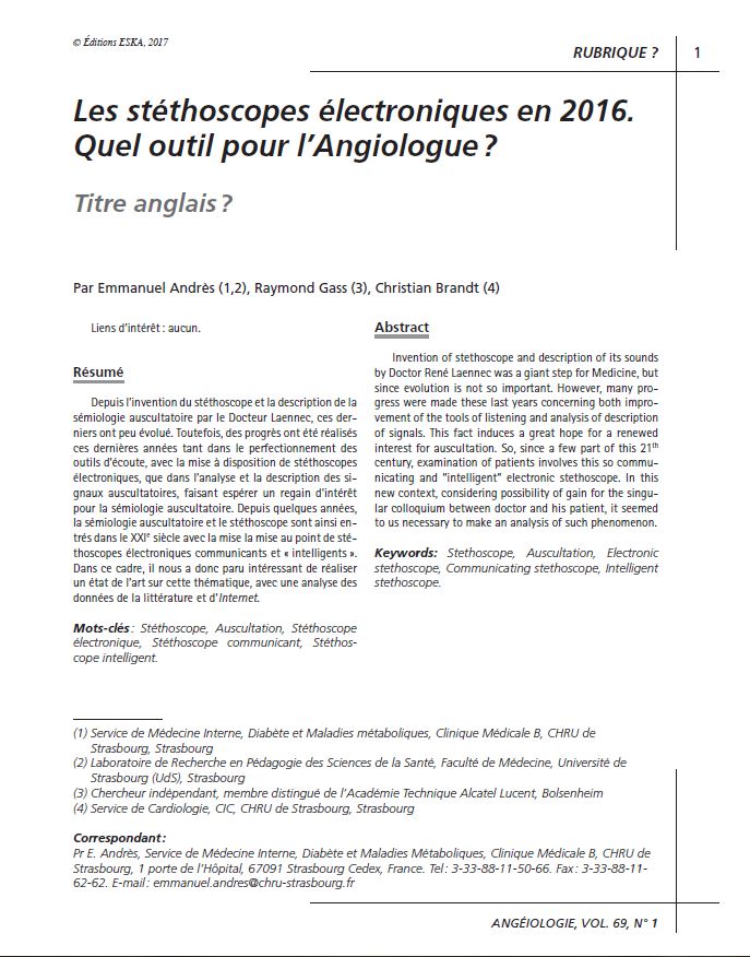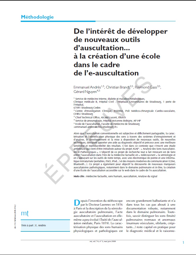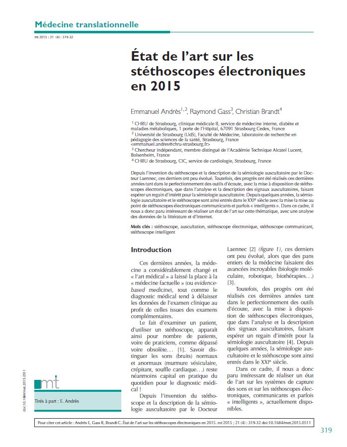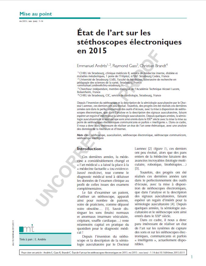![]() Etat de l'art sur la sémiologie auscultatoire et sur les stéthoscopes électroniques en 2015 Emmanuel Andrès, Raymond Gass, Christian Brandt L'article est disponible sur le site de la revue (cliquer sur la page de garde, à gauche) |