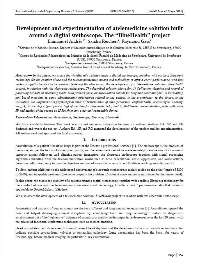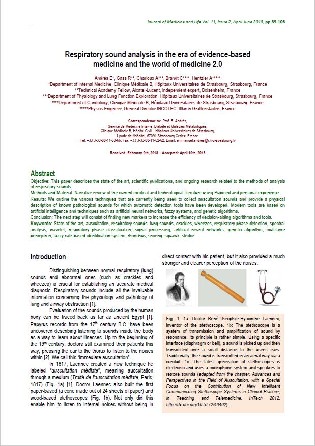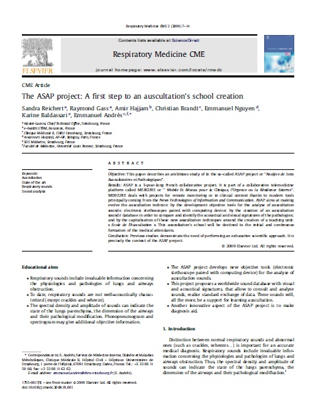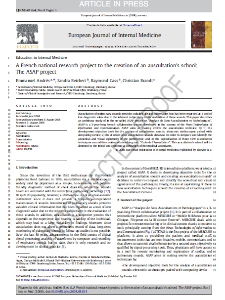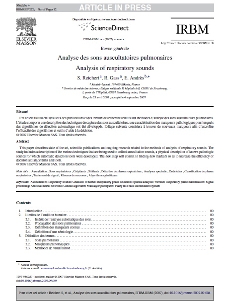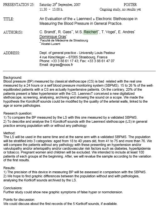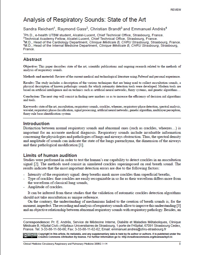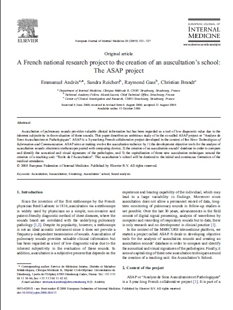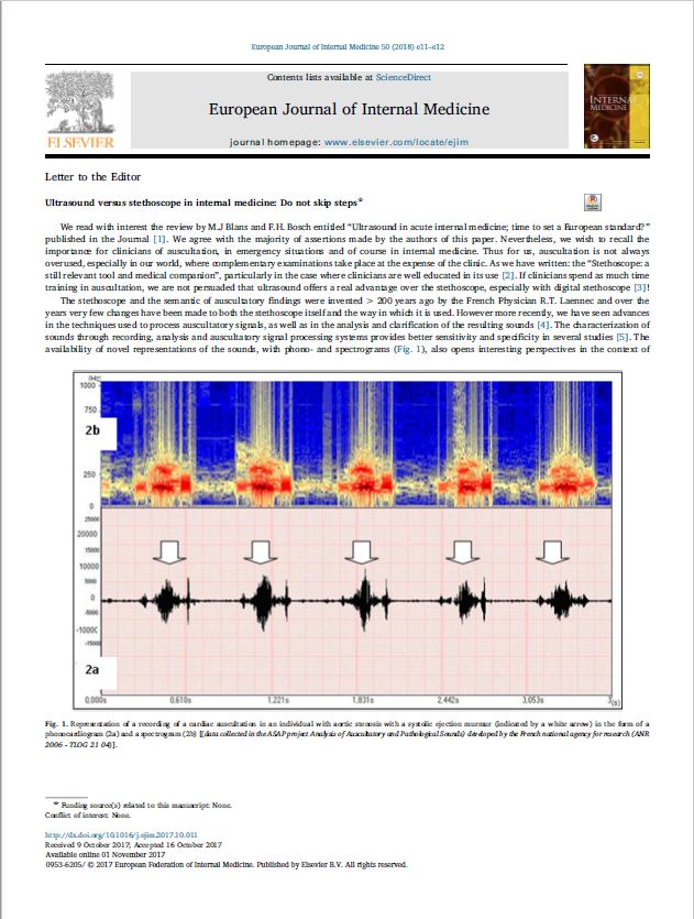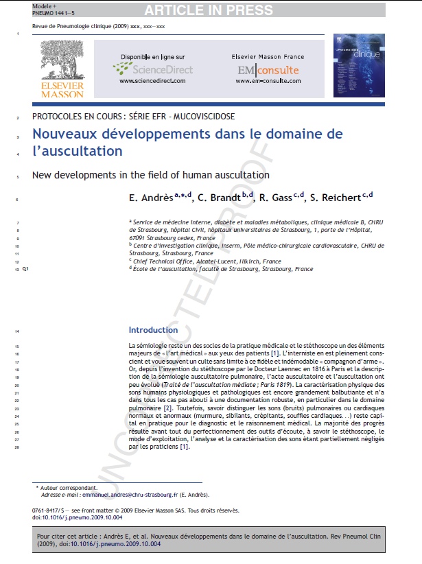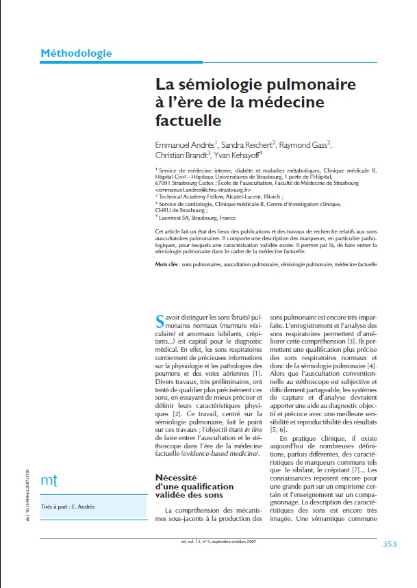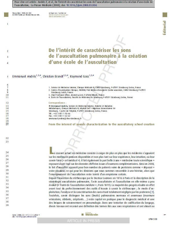 ![]() Etat de l'art sur la sémiologie auscultatoire et sur les stéthoscopes électroniques en 2015 Emmanuel Andrès, Raymond Gass, Christian Brandt L'article est disponible sur le site de la revue (cliquer sur la page de garde, à gauche) |