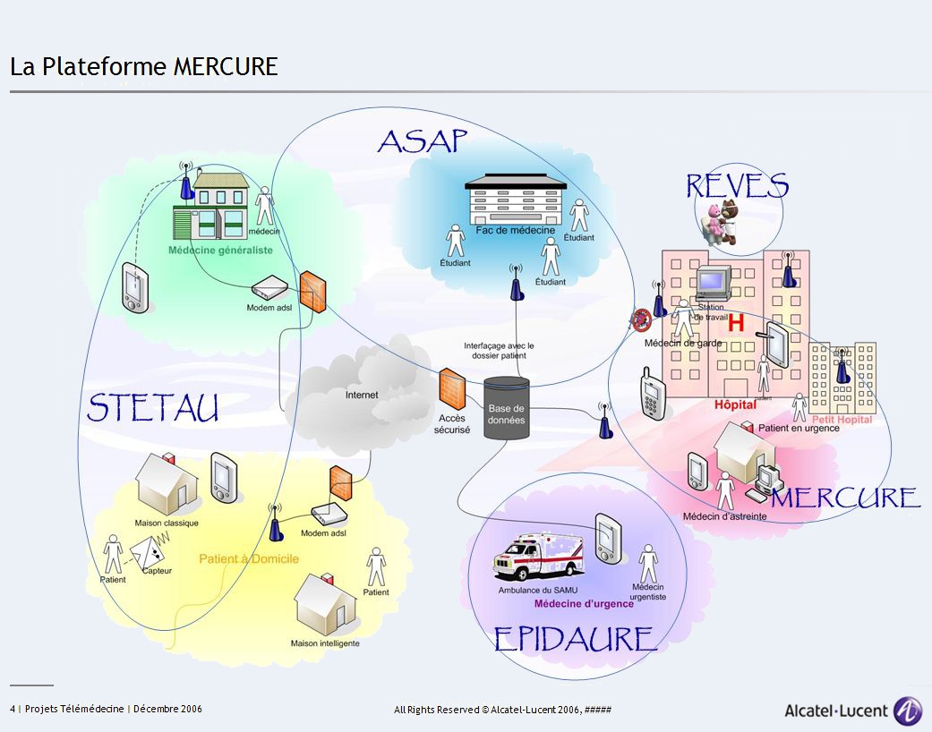 menés conjointement par l'IRCAD et Alcatel Lucent. Il est apparu assez rapidement que le concept était trop ambitieux pour faire l'objet d'une labellisation par le pôle de compétitivité "Innovations Thérapeutiques". Les briques STETAU et ASAP ont été extraites et déposées avec succès. La brique EPIDAURE a été confiée à l'UTBM pour être ré-orientée vers la gestion intelligente de la flotte des services d'urgence. Ce projet a été refusé par les experts de l'IRCAD et de l'ULP pour manque d'innovation. La description de la plateforme MERCURE est disponible: il suffit de cliquer sur le synoptique ci-dessous pour accéder à une copie en pdf. L'acronyme et les significations des initiales, les concepts et les dessins d'architectures ont été repris sans notre autorisation dans des publications de l'UTBM |