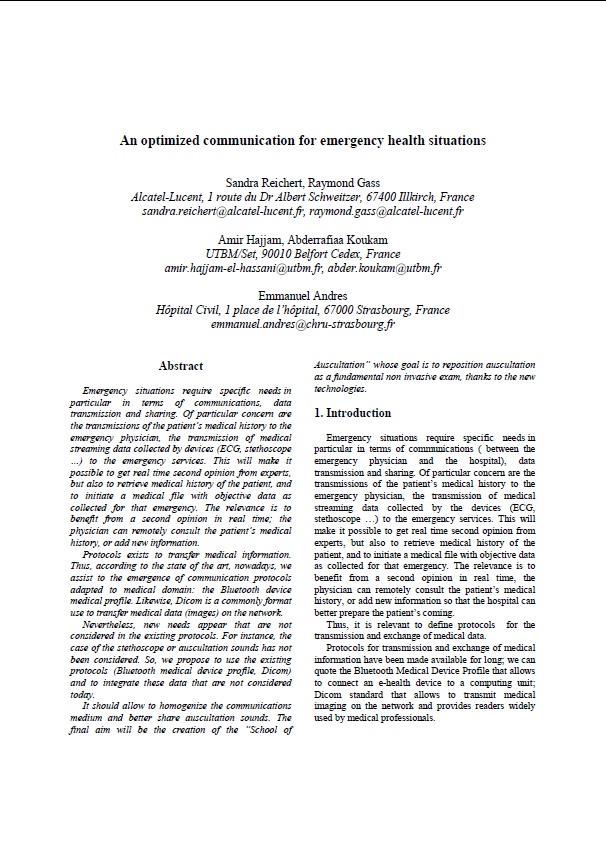 ![]() Development and experimentation of a new digital communicating and intelligent stethoscope E. Andrès, S. Reichert, C. Brandtd, N. Hill, R. Gass L'article est disponible sur le site de la revue (cliquer sur la page de garde, à gauche) |