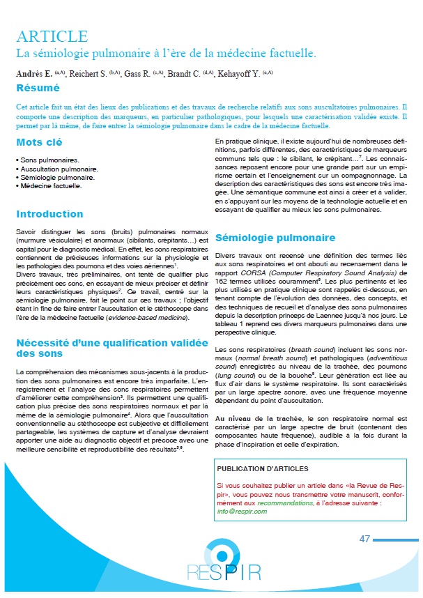 ![]() revue Respir septembre 2007 ; 6 : 47-50 E.Andrès, S.Reichert, R.Gass, C.Brandt pdf disponible sur le site de la revue: http://www.respir.com/revue.asp Cet article fait un état des lieux des connaissances actuelles sur la description des "bruits pulmonaires" |